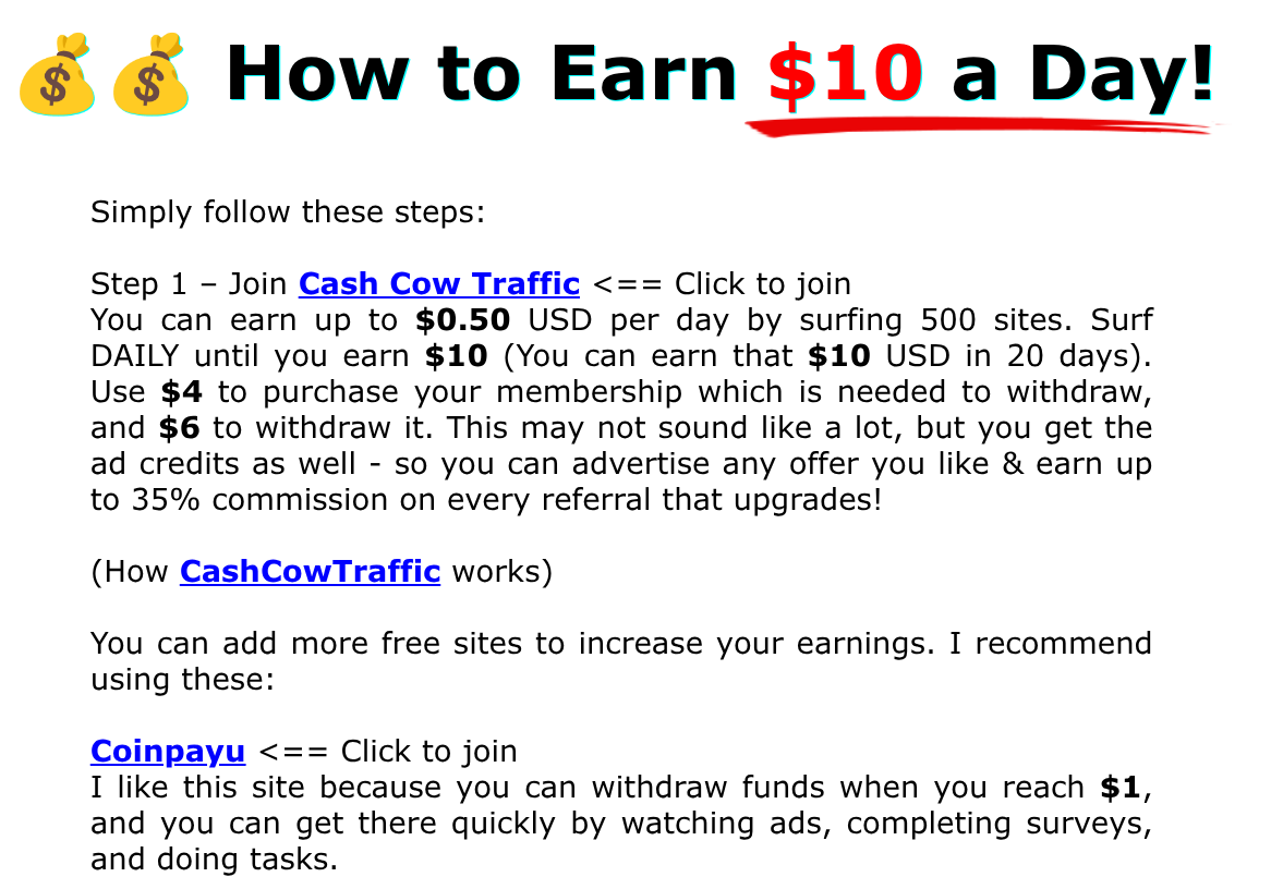 Step 1 – Join Cash Cow Traffic <== Click to join You can earn up to $0.50 USD per day by surfing 500 sites. Surf DAILY until you earn $10 (You can earn that $10 USD in 20 days). Use $4 to purchase your membership which is needed to withdraw, and $6 to withdraw it. This may not sound like a lot, but you get the ad credits as well – so you can advertise any offer you like & earn up to 35% commission on every referral that upgrades!